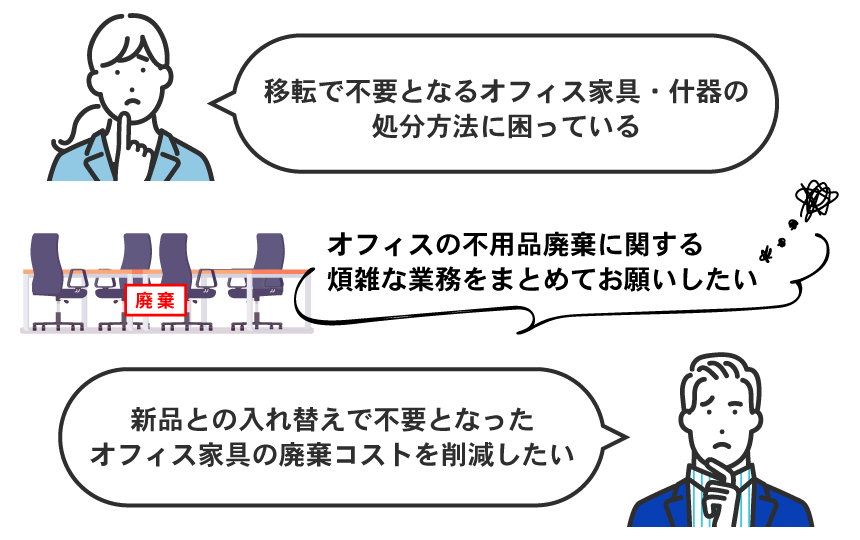 当サービスは、オフィスの移転・改装・統廃合などに伴う不要なオフィス家具や什器の回収・買取、リサイクル、廃棄を一括で対応する、法人様向けの仕組みです。 個人のお客様のご利用には対応しておりませんので、何卒ご了承ください。
